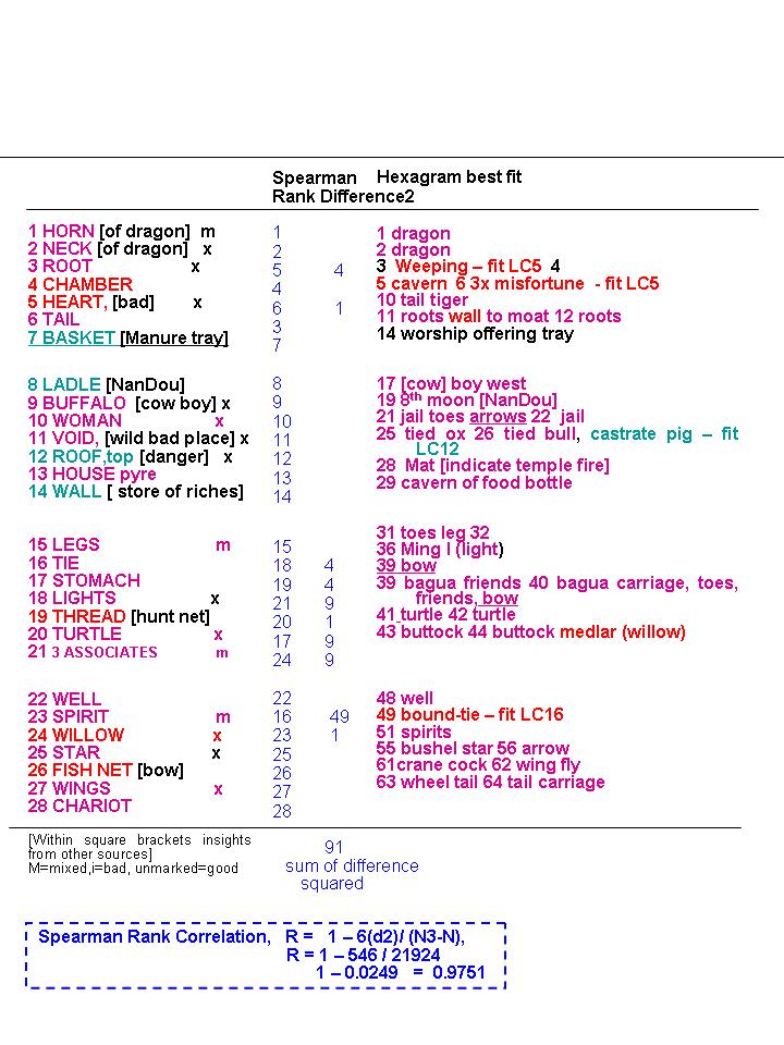 Spearman Rank Correlation It is possible to determine by the Spearman Rank Correlation how the hexagrams' symbols correlate to the names of the constellation, as illustrated in Table 2. The Lunar Constellations are ranked from 1 to 28. Symbols of the hexagrams which are similar to those of the lunar constellations are also ranked. Most the hexagrams symbols are almost at the same sequence as the lunar constellations. Some of the hexagrams symbols may be further away. The differences of the ranks of the symbols and the names of the lunar constellation are surprisingly very small, only 91. The Spearman Rank Correlation coefficient is 0.9751, which is very highly significant, meaning the hexagrams symbols are practically the same as the names of the 28 Lunar Constellations! We have broken an millennial old enigma about how the names of the lunar Constellations arose! It is thus statistically proven that the names of the 28 Lunar Constellations originated from key symbols in the hexagrams!
