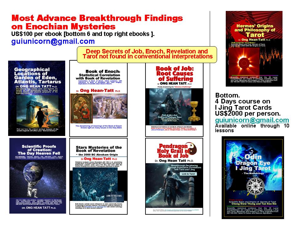 One mysterious part of the Book of Job is the reference in Chapters 40 to 41 to the monsters behemoth and leviathan. Unable to penetrate the meanings of the Book of Job conventional interpretations are that these monsters are symbolical. There is a very deep meaning to Chapters 40 and 41. Ancient cultures associated the dragon with kings who would be "Pendragons"., "Pendragon" means "chief of dragon" or the one who rides and controls the dragon. Job was one of the ancient Pendragons This term "Pendragon" features in that Arthurian legend of Camelot and the Holy Grail. Arthur was Arthur Pendragon and his father Utter Pendragon. Arthur's grandfather "Fisher King" Pelles of Corbenic guarded the Holy Grail. Chapters 40 to 41 were to remind Job of his "riding the dragon" status. The root causes of sufferings can be destroyed by that Pendragon. The exegesis has a remarkable statistical comparison of the issues in the Book of Job to the meanings of the Tarot Major Arcanas and also the hexagrams of the I Jing. There is a systematic step by step progress from the initial Chapter or card or hexagram to the end about the development of the person to end sufferings, vis that Messianic Pendragon. The 42 Chapters of the Book of Job contain the secrets of the Holy Grail. They are the Divine blueprint for the progressive development of the Pendragon! The ancient cultures tell the same things about the root causes of sufferings and that these sufferings can be destroyed only by the coming of the Messianic Pendragon! |