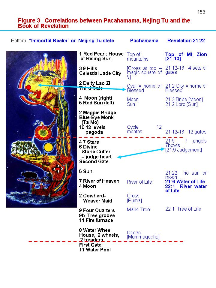 With respect to the Pachamama and Neijng Tu iconography, let us compare them to the imagery of Chapters 21 and 22 of the Book of Revelation, which concerns the “City of God” and Eternity. In a previous research [www.guiculture.com/ebphseal.htm#seal] we found statistically significant correlations between features of either the Pachamama and Neijing Tu iconography and features of the Seal Of Solomon. With respect to the religion of Pope Francis, this exegesis here establishs the amazing links of the Pachamama and Neijng Tu iconography to the Book of Revelation. Figure 3 shows the amazing correspondences between features of the Book of Revelation and the iconography of Pachamama and Neijing Tu |