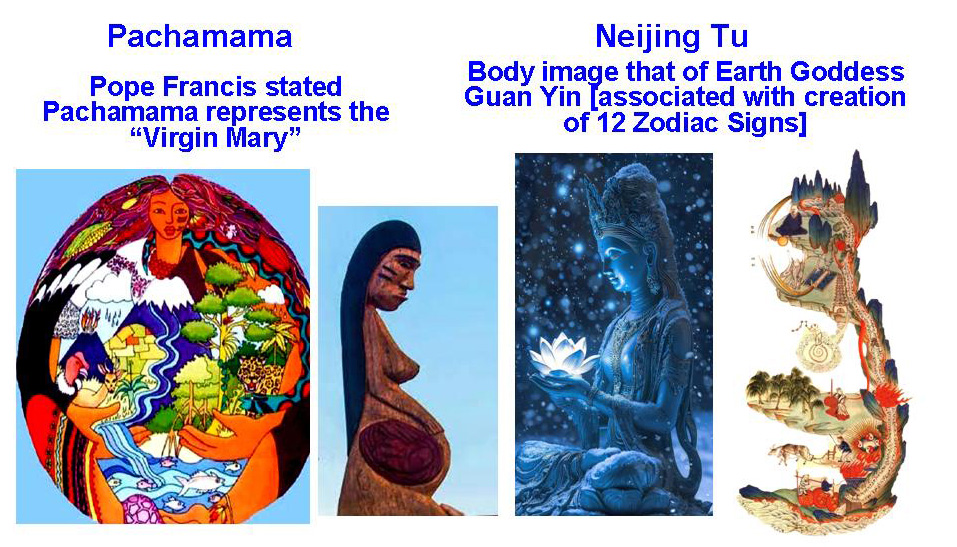 ![]() In the above Figure, the features of the Pachamama iconography and those corresponding of Nei Hing Tu can be numbered. The Table below show that there is a practical complete correspondence between Pachamama and Nei Jing Tu. For comparison the Table also shows that the Pachamama iconography has a significant correlation with Chapters 21 and 22 of the Book of Revelation of 0.9333. ![]() |