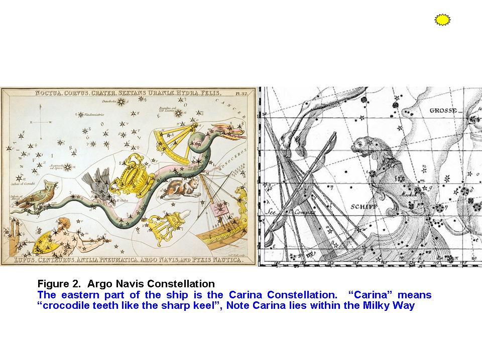 Argo Navis was the legendary ship used by Jason and the Argonaiuts in search of the "Golden Fleece". It is also the "Boat of Osiris", taking him along the "River of Life" i.e. the Milky Way It represents a journey into evaluating one's inner self. Argo Navis occupies the portion of the Milky Way between Canis Major and Centaurus. (Figure 2) It lies south of the ecliptic, east of Hydra's mouth. Its brightest star is Canopus, Various legends depict Argo Navis as the ship sailing the Milky Way.