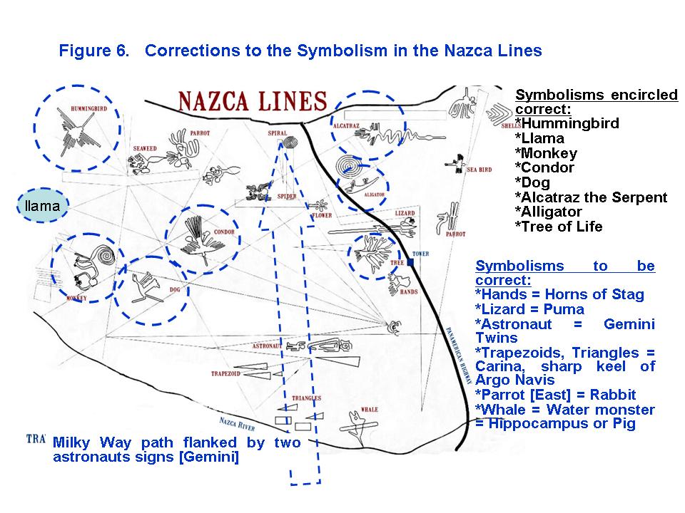 The Tetra-gammadion is associated with the 8 points of the compass. Thus, another correspondence is that the Tarot "Green Man" has spme association with the "Compass", a glyph in the Nazca Lines. One practical purpose of the Nazca Zodiac [also in other Zodiac systems] is that it presents the sequential phases of a "spiritual journey", from start to finish. The different phases [in 12 major steps] appeared to be activated by worship rituals regulated by the timings of the Zodiac signs. The ancient cultures, stemming from a more distant past, should have many similarities. At that ancient time, their worships include geomancy rituals of astrology and Feng Shui. Thus, they would have many Zodiacal similarities. Accepting these Zodiacal significance, the conventional symbolisms of the figures in the Nazca Lines may have corrected as illustrated in Figure 6. We can now have a complete picture of the purpose of the Nazca Lines. The secrets of the Nazca Lines are cracked – the Nazca Lines are the remnants of the ancient Peruvian Zodiac system!