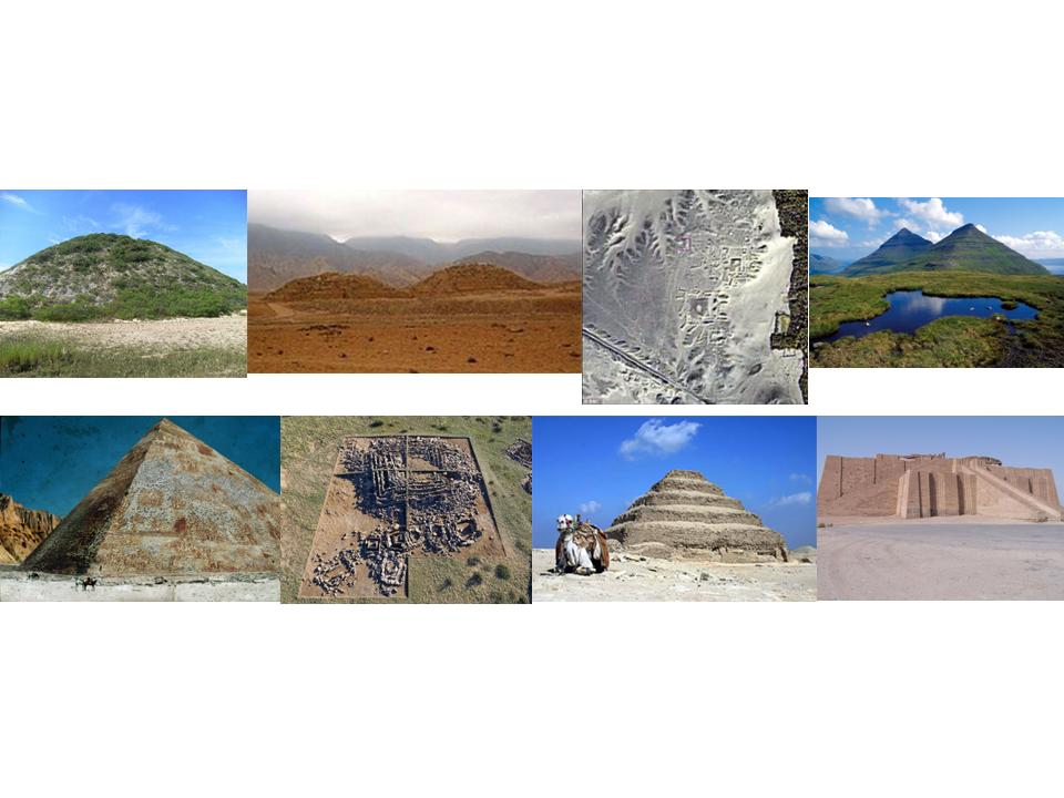 Figure 2. The Ancient Pyramids Top. Left to Right: Ancient Brazilian pyramid 3000 BC, Caral pyramids in the arid Supe Valley, some 20 km from the Pacific coast 2700 BC Alaska (underground) older than Egypt's. 10000 to 12000 years ago Kola Peninsular , Russia 7000 BC and older Bottom row. Left to Right: Gobi desert China pyramid 4000 BC Kazakhistan Siberia pyramid 4000 BC Step pyramid Djoser Egypt 2700 BC