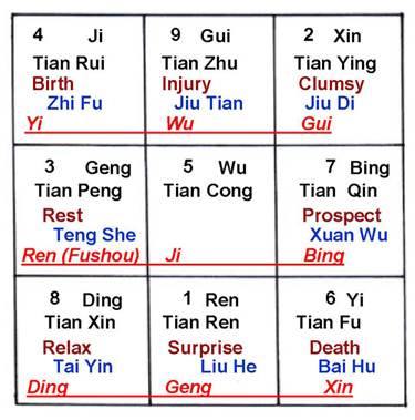 2.Hour Stem at death was Geng. This appears in Palace 3 in Di Pan and Palace 1 in Tian Pan. Bruce Lee met with misfortune in Palace 3 with Tian Peng star and with surprise in Palace 1 with Tian Ren.