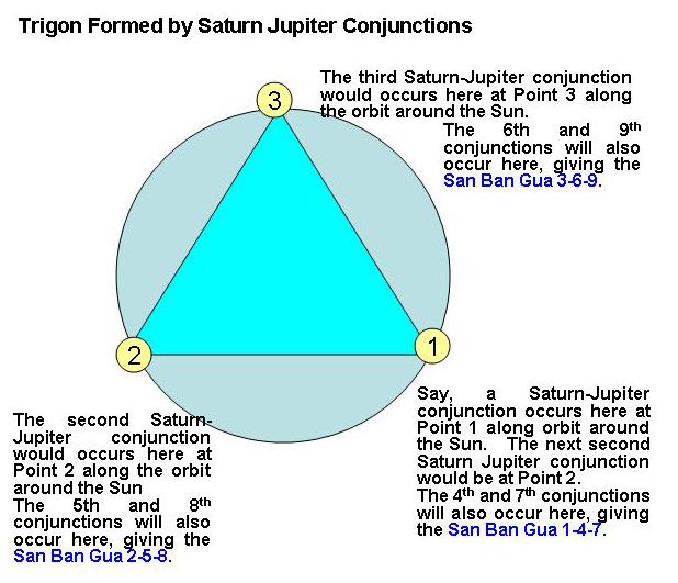The features of the Trigon shows that the conjunction of Saturn and Jupiter is the basis of the 20 years period of the "Yun". The Trigon features would even spell out the well known sacred auspicious "San Ban Gua" of 1-4-7, 2-5-8, 3-6-9
