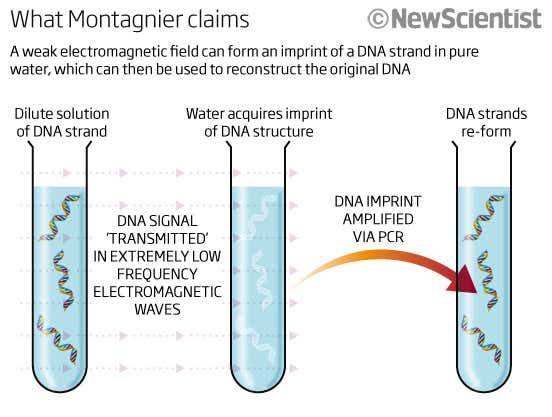 Several hours later, the contents of both test tubes were put through polymerase chain reactions to identify any remnants of DNA – a process that subjected the contents to enzymes that would make copies of any DNA fragments they found. According to Montagnier, the DNA was recovered from both tubes even though the second should have only contained water. (Can Our DNA Electromagnetically 'Teleport' Itself? One Researcher Thinks So. By Clay Dillow Posted January 13, 2011. Popular Science. )