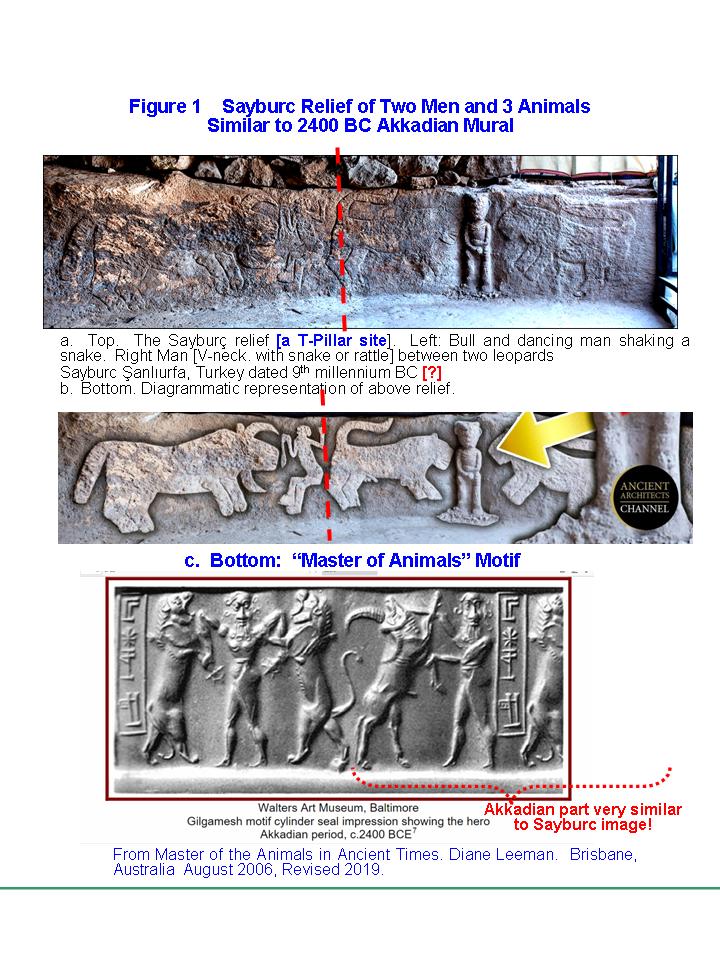 There are animal and human motifs in the T-Pillars sites, like of Gobekli Tepe. There are much speculations about their meanings, but contradictions could have been resolved if there had been deeper references to the wider culture in Mesopotamia, especially of Sumerian and Hurrian cultures. The previous article especially showed that the Sayburc relief at Sanliufa about 17 km southwest of Gobekli Tepe depicts a man between two leopards (Figure 1). This is well known "Master of Animals" motif, common in the 4000 BC and after in Mesopotamian cultures. This Sayburc relief is very similar to an 2400 BC Akkadian wall mural. The previous article pointed out that this "man between two beasts" especially refers to Flood hero Gilgamesh. A number of Sumerian murals show Gilgameah with the bull and two lions. The identification of Gilgamesh in the Sayburc relief will facilitate interpretations of other motifs in the T-Pillars sites. In the Sayburc relief, the man in front of the bull would also be Gilgamesh. Enkidu, the male lover of Gilgamesh was also associated with the bull.
