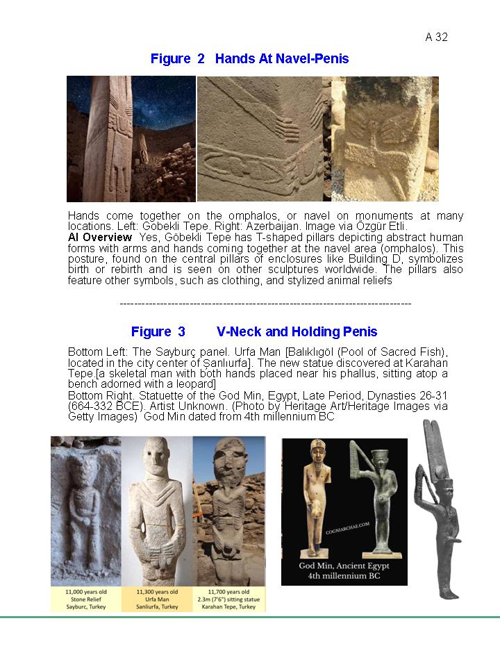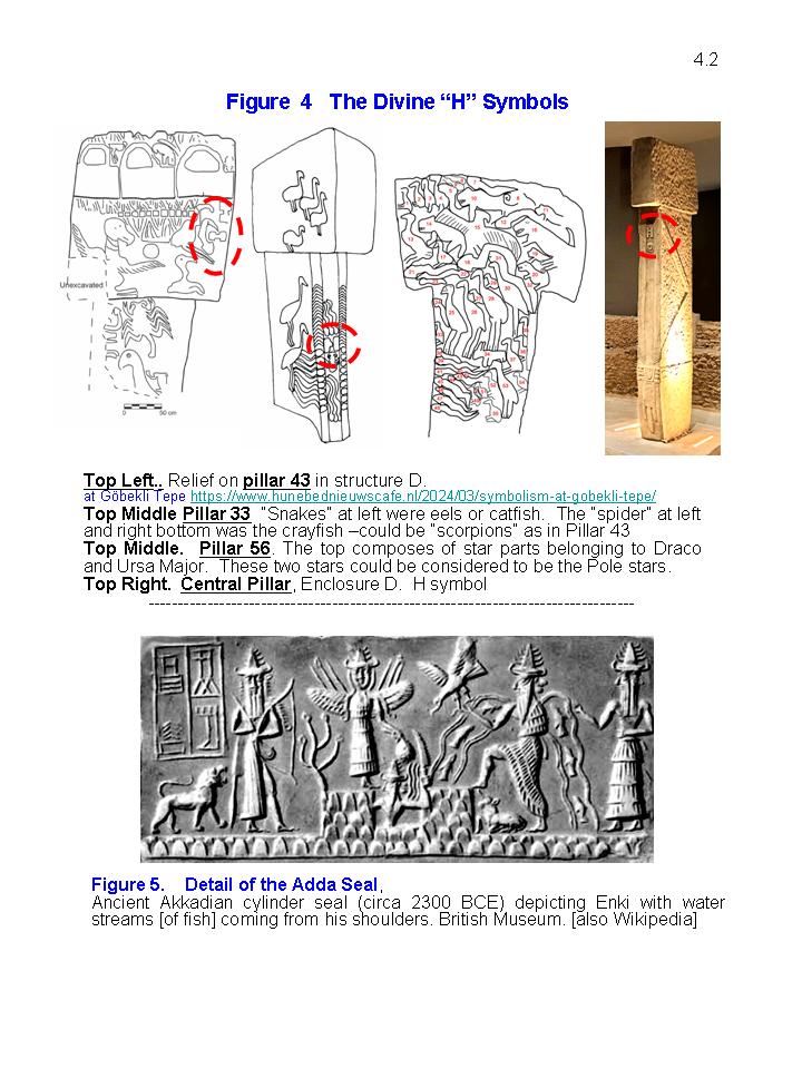 Figure 2 shows one of the central pillars at Gobekli Tepe, with the image of hands close at the navel. This image is similar to that of the Urfa Man at Sanliufa and also Karahan Tepe. These hands at the navel could also be hands at the penis (Figure 3). This was, of course, what is seen in the Sayburc relief. It was the image of the god Enki holding his penis! It is natural that the Gobekli Tepe motifs include the "H" which was rightly taken as the symbol of the "Divine" "supreme god". Wherever this "H" symbol is seen, it indicates the object was related to something divine. This "H" symbol was seen in Pillar 33 and 43 (Figure 4). Pillar 33 is interesting as it shows this "H" was associated with a river of fishes. This is a similar image of the 2300 BC Akkadian seal of Enki (Figure 5). There is no doubt that the images of Gobvekli Tepe's Pillars 43 and 33 were depicting a similar scene as the 2300 BC Akkadian seal of Enki god of creation and fertility.