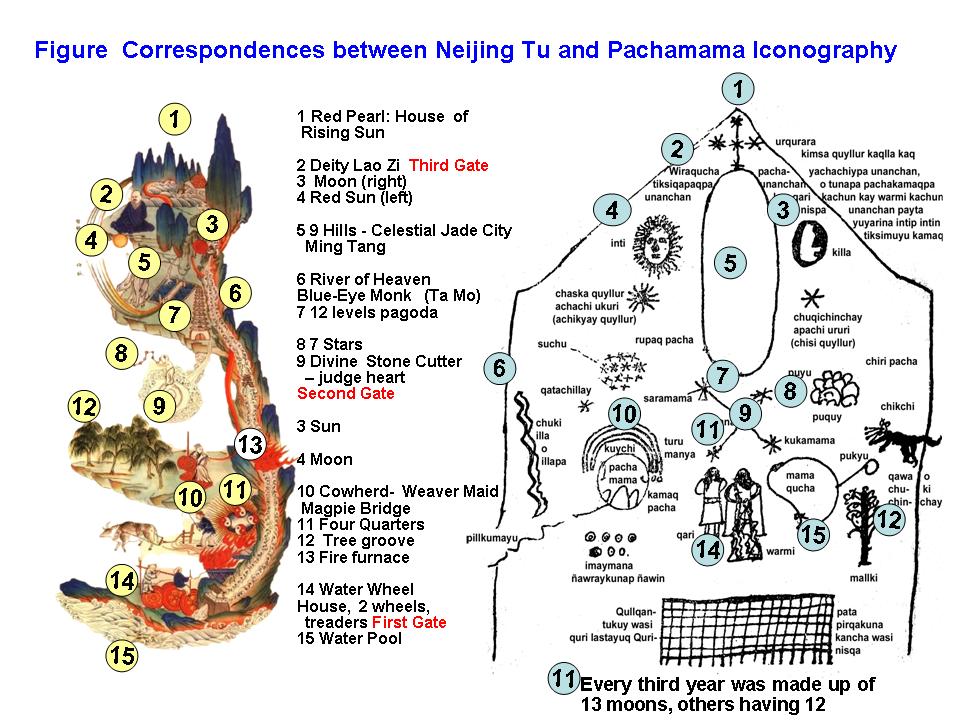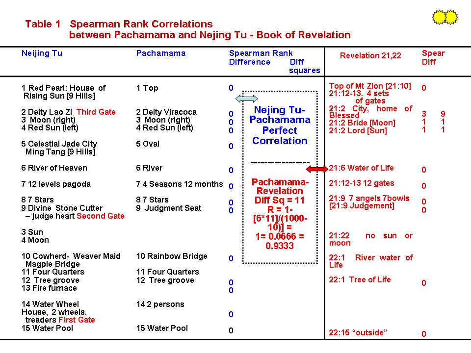 ![]() In the above Figure, the features of the Pachamama iconography and those corresponding of Nei Hing Tu can be numbered. The Table below show that there is a practical complete correspondence between Pachamama and Nei Jing Tu. For comparison the Table also shows that the Pachamama iconography has a significant correlation with Chapters 21 and 22 of the Book of Revelation of 0.9333. ![]() |