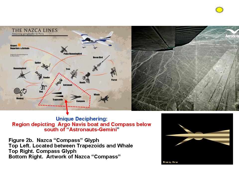 Unlocking Secret of Nazca Lines Zodiac A long lost secret unlocked is that the Argo Navis image in the British Zodiac landscapes indicate that the Nazca Lines complex contain this "Argo Navis ship" imaginary at the southern part of the Nazca Lines just south of the two "Astronauts". These images are not two "Astronauts but the two persons in the Gemini Constellation! Argo Navis may be symbolized by the sharp trapezoids and triangles south of the two "Astronauts". Once we make this connection, the whole Nazca Lines imaginary falls into shape! The British Zodiac landscapes indicate that the complexes have an orientation where Argo Navis forms the southern end of the Milky Way, flanked by Leo on one side and Taurus on the other (Figure 4). Once we have this, we can decipher further the meanings of the Nazca Lines: