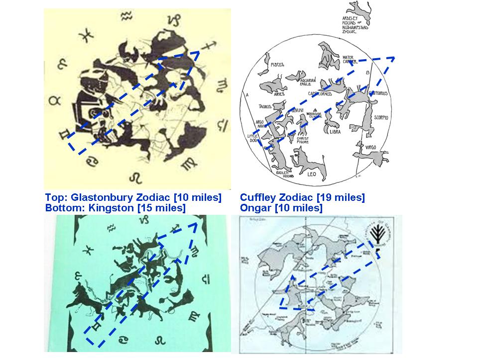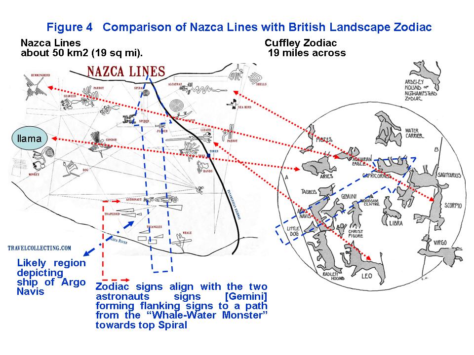This fantastic article continues the cracking of the secrets of the Nazca Lines. [Part 1] The statistical analysis in the previous article show that major animal symbols of the Nazca Lines are highly correlated and thus similar to the Chinese Zodiac animals! The Nazca Lines form a Zodiac complex of about 50 km2 [6 x 3 miles]. Landscapes, ranging from 10 to 19 miles diameters, using animals symbols to form Zodiac patterns can also be seen in the United Kingdom in the Glastonbury, Cuffley, Kingston and Ongar Zodiacs (Figure 1). These British Zodiacs are highly similar in depicting a Western type of Zodiac. They can throw light on further significance in the Nazca Lines. There is a unique feature in the British Zodiac landscapes which could throw light on the true meanings of the Nazca Lines. In the British Cuffley and Glastonbury Zodiacs there is a unique symbol, the 'Argo Navis" constellation not far from the two boys representing Gemini. Why is the Argo Navis depicted? |