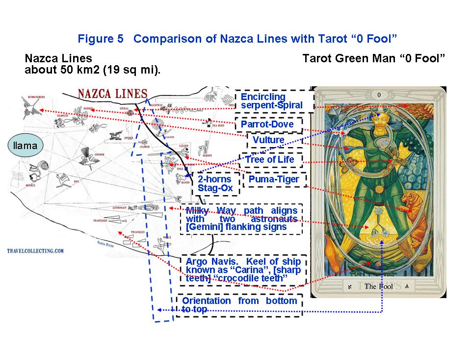 Conclusion Some have taken great efforts to show the lines in the Nazca and Palpa regions. Unfortunately, these lines are in confusing patterns. It is much easier to decipher the Nazca and Palpa glyphs by looking at animals and geometric designs and compare them with the lore of various ancient cultures. Thisway a number of the Nazca lines glyphs can be re-interpreted. The astonishing thing is that the Nazca Lines imaginary is also reflected in the imaginary of the Tarot Major Arcana of "0 Fool" (Figure 5). The position of Gemini between the legs of the "Green Man" is the Gemini in the two "Astronauts" of the Nazca Lines. There would be about 9 correspondences between the Nazca Lines and Tarot "0 Fool" image. This has a statistical significance of one in 512 or probability of 0.00195