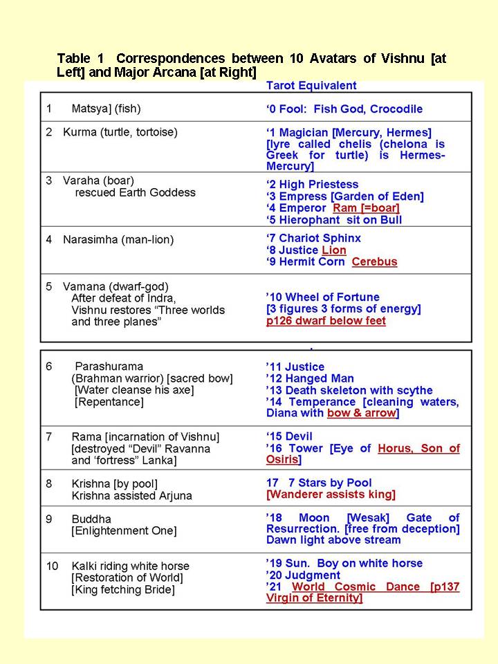 Like as how we scientifically statistically compared 28 Lunar Constellations with Major Arcanas, likewise we compare the properties of the 22 Major Arcanas with those of the "10 Avatars" of Vishnu. This is illustrated in the Table 1.