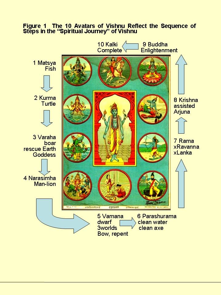 One order of "10 Avatars" of Vishnu are: Matsya the Fish; Kurma the Turtle; Varaha the Boar; Narasimha the Man-Lion; Vamana the dwarf; Parashurama the warrior; Rama; Krishna or Balarama; Buddha or Krishna; and Kalki the Messiah on white horse.