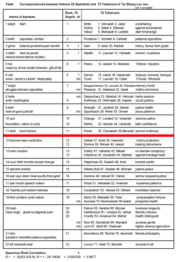 The Significant Correlation In this exegesis, we will look at how the properties of the Chinese 72 Talismans of Tai Shang Lao Jun (or Kabala 72 Angels of the Shemhamphorash) correspond with the Divine properties of the Hebrew 22 alphabets. The Kabala 72 Angels of the Shemhamphorash are known to operate in 36 pairs, each pair with a Day or Night aspect. There are 22 Hebrew alphabets. In comparing, some of the 72 Angels would be in excess and may not show up – they could represent meanings added through the ages. The Table shows that many of the meanings of 72 Angels of the Shemhamphorash would correspond with meanings of the Hebrew alphabets almost in the same order. There are a few "jumps", a phenomenon which would be expected to happen due to deviations down the ages. The central column shows the adjusted rankings of the 72 Angels vis the matching Hebrew alphabets. Differences in rankings are squared and incorporated into the Spearman's Rank Correlation analysis.