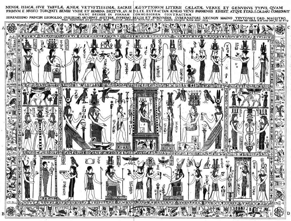 Besides drawing from Hellenistic and Biblical themes, the Major Arcanas derived much imagery from ancient Egyptian iconography. It has been earlier stated that meanings of the Major Arcana and Hebrew alphabets have very significant correlation of 0.9500. This indicates that the Major Arcanas have some origins from the much older Hebrew alphabets. The Hebrew alphabets are said to be the oldest alphabets dating from 1750 BC. Moses, back in around 1450 BC, used these Hebrew alphabets to compile the Torah. As Moses learnt in the Egyptian institutions, it was likely that the Hebrew alphabets had some origins in the Egyptian lore. Some have connected Tarot to the Egyptian Bembine Table of Isis, as illustrated below. It is also known as Mensa Isiaca, is a first century BC bronze tablet.